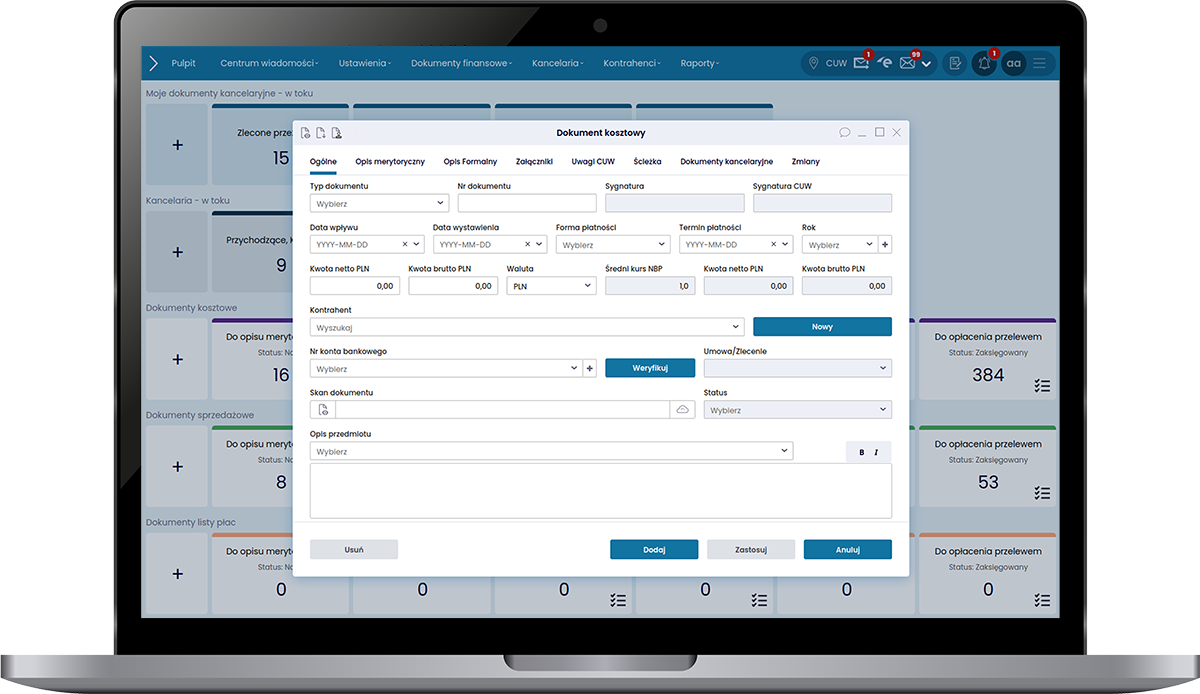 Aplikacja SmartCUW realizuje proces zarządzania i obiegu dokumentów kosztowych oraz sprzedażowych, procesowanie dokumentów kancelaryjnych, list płac, umów oraz budżetów jednostek.